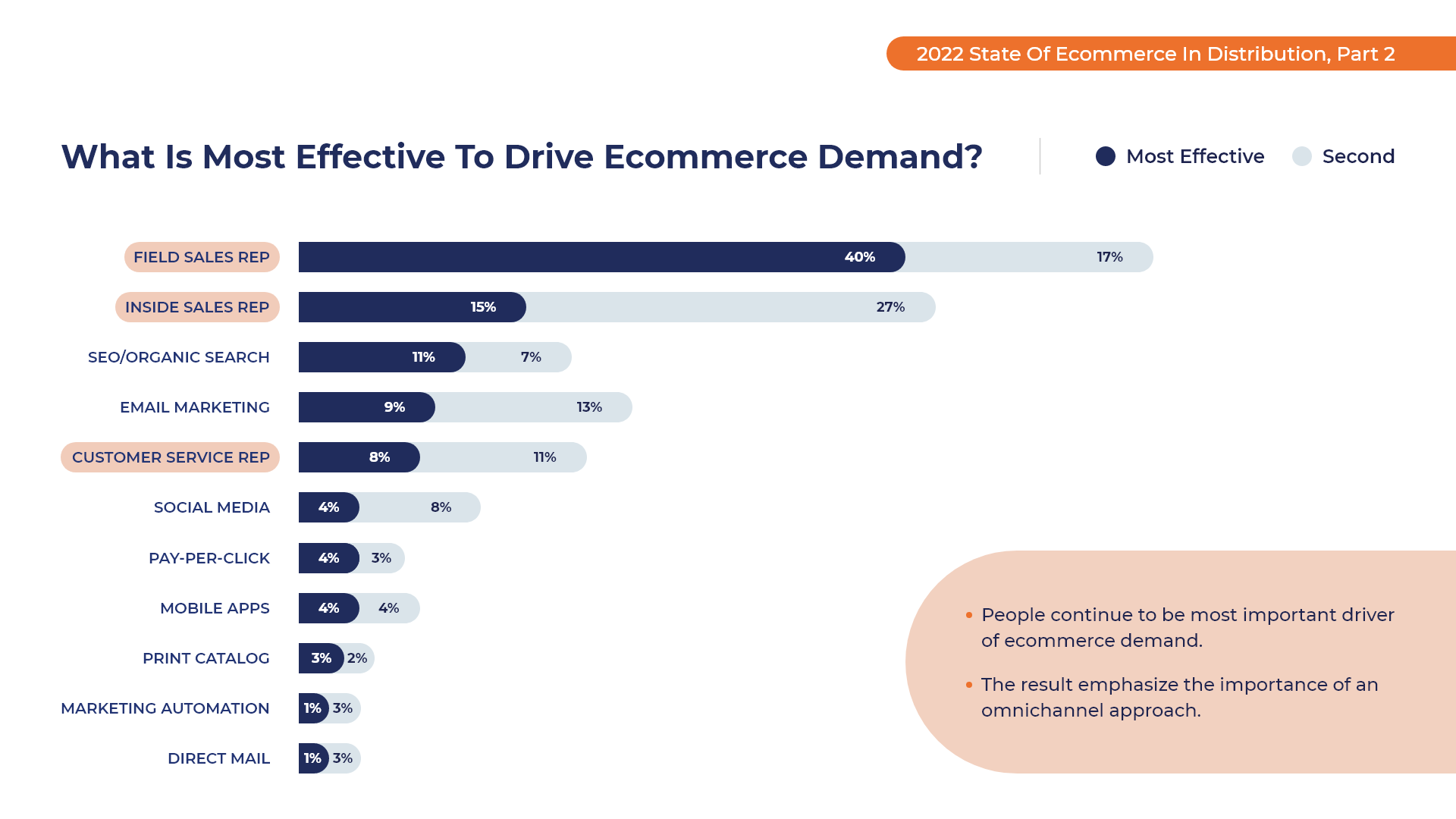 Interestingly, of the companies surveyed, people (Field Sales, Inside Sales and Customer Service Representatives) were reported to be the most effective drivers of Ecommerce demand.
