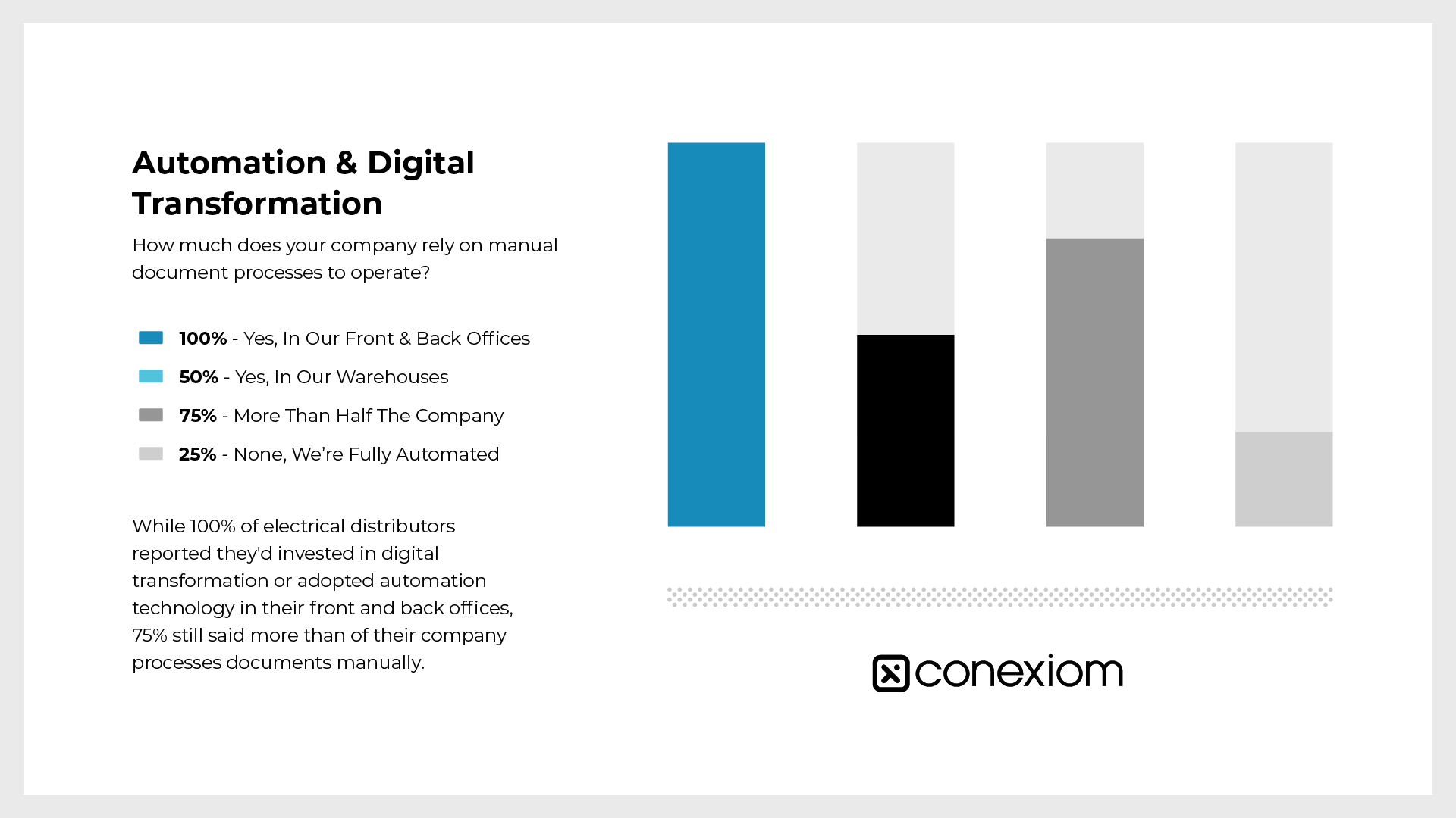 A key finding from our survey is that 75% of electrical distributor decision-makers reported that more than half of their company processes documents manually, despite 100% reporting they have invested in digital transformation and automation for front and back-office processes. This represents a disconnect between what should be a transformative investment in better ways of operating, and the complex reality businesses must transform to see a return.