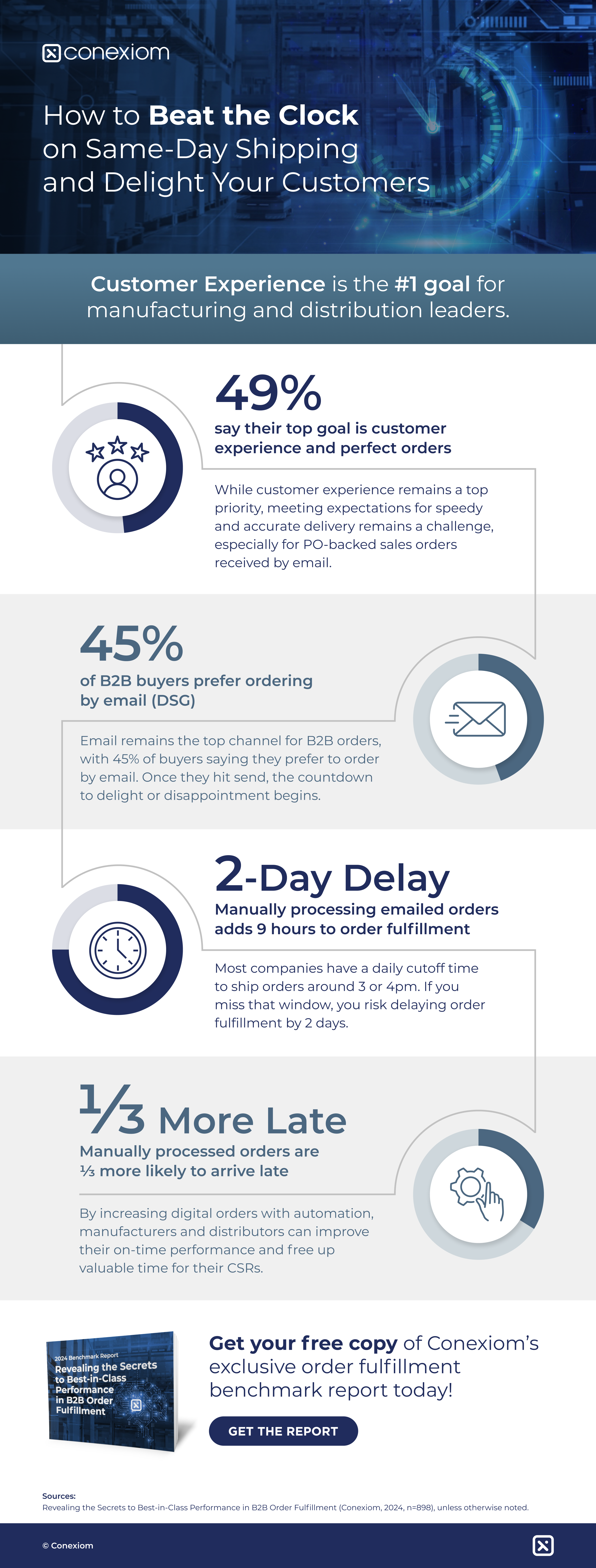 Meeting expectations for speedy and accurate delivery is a crucial aspect of providing exceptional customer experience in the manufacturing and distribution industry. By understanding the impact of email orders on order fulfillment and embracing automation, businesses can beat the clock on same-day shipping and delight their customers. The attached infographic and our new benchmark report serve as valuable resources to guide businesses towards best-in-class performance in B2B order fulfillment.